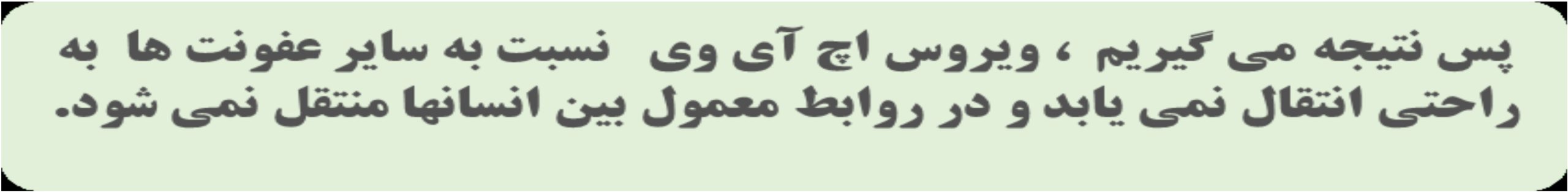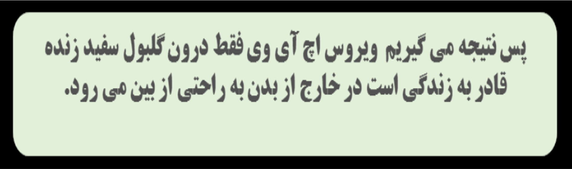 گلبول سفید هم فقط در خون و ترشحات جنسی است؛ پس همانطور که میکروب بیماریهای اسهالی از طریق تنفس منتقل نمی شود؛ ویروس اچ آی وی نیز از طریق تماس های عادی ذیل منتقل نمی شود.